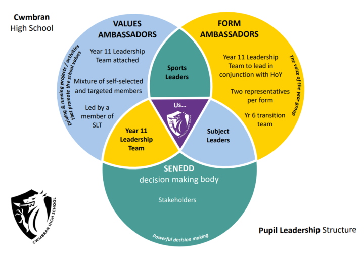 Our structure is built around three core leadership strands, Values Ambassadors, Form Ambassadors, and Subject Leaders, all supported by our Year 11 Leadership Team. Together, they contribute to our whole‑school decision‑making body, the Senedd.